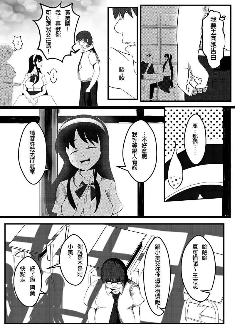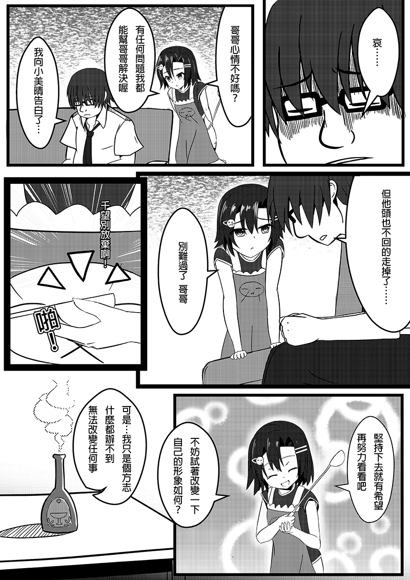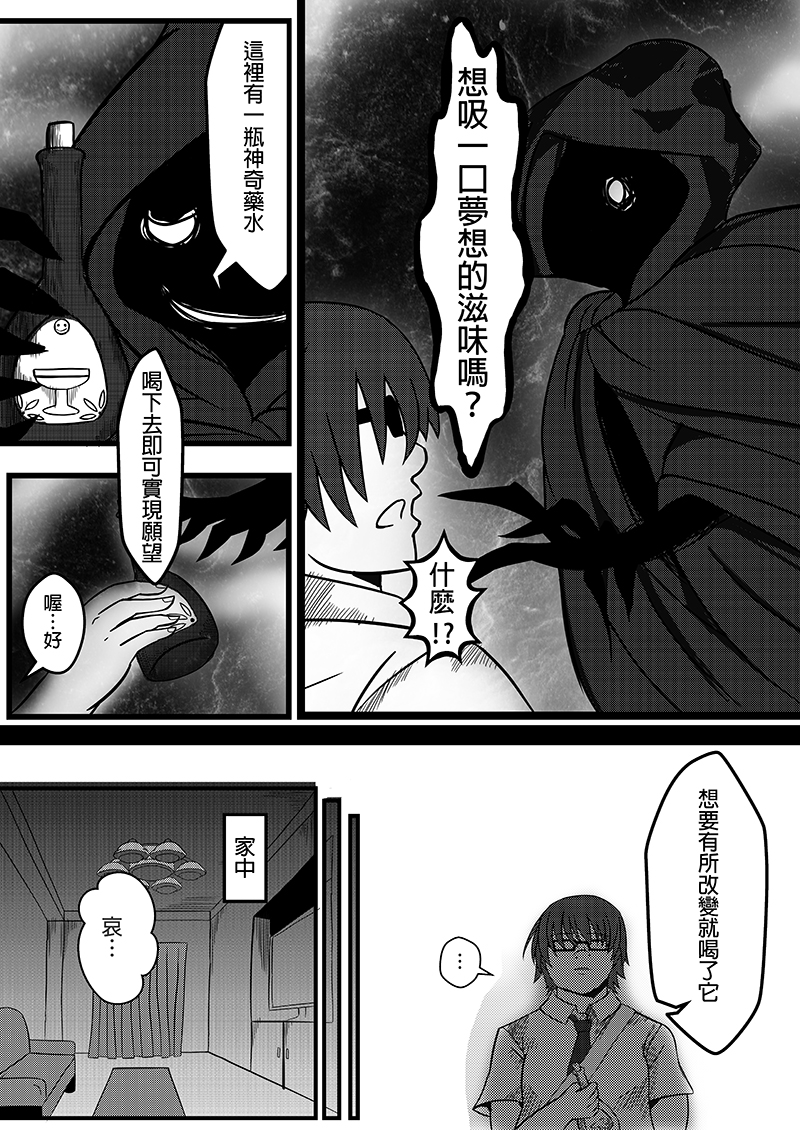 主角「王方志」,某天對心儀很久的對象「美晴」告白失敗,失魂落魄地走在回家路上,遇到一位神秘的連帽披風黑影人,主角透過黑影人獲得了一瓶神奇藥劑,聽說能實現任何夢想,結果王方志喝下後……