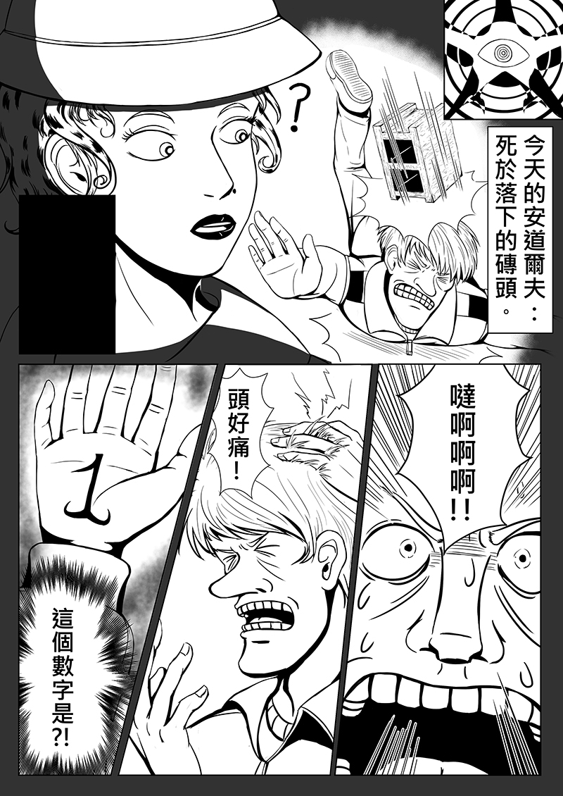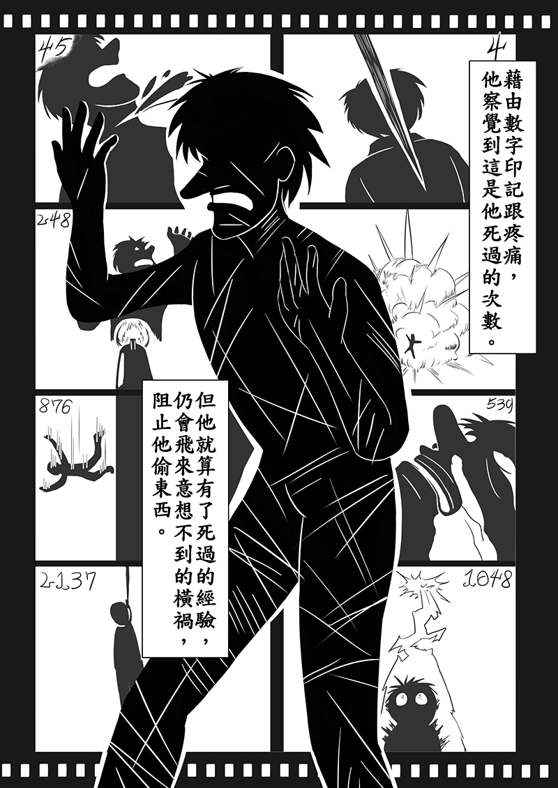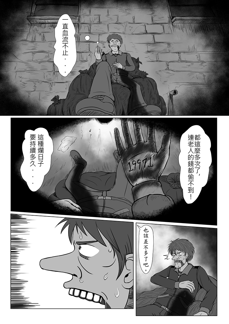 一個小偷坐在巷子裡的垃圾堆上,一手摀著不斷流血的傷口,一手上面有著數字。