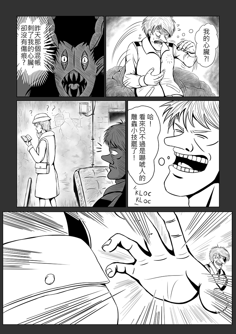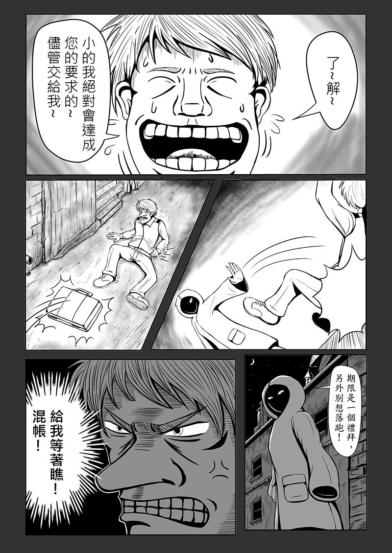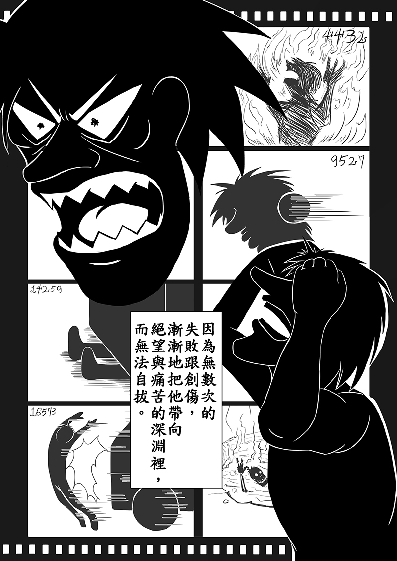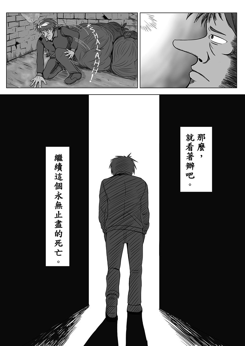 一個小偷坐在巷子裡的垃圾堆上,一手摀著不斷流血的傷口,一手上面有著數字。