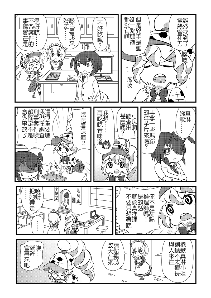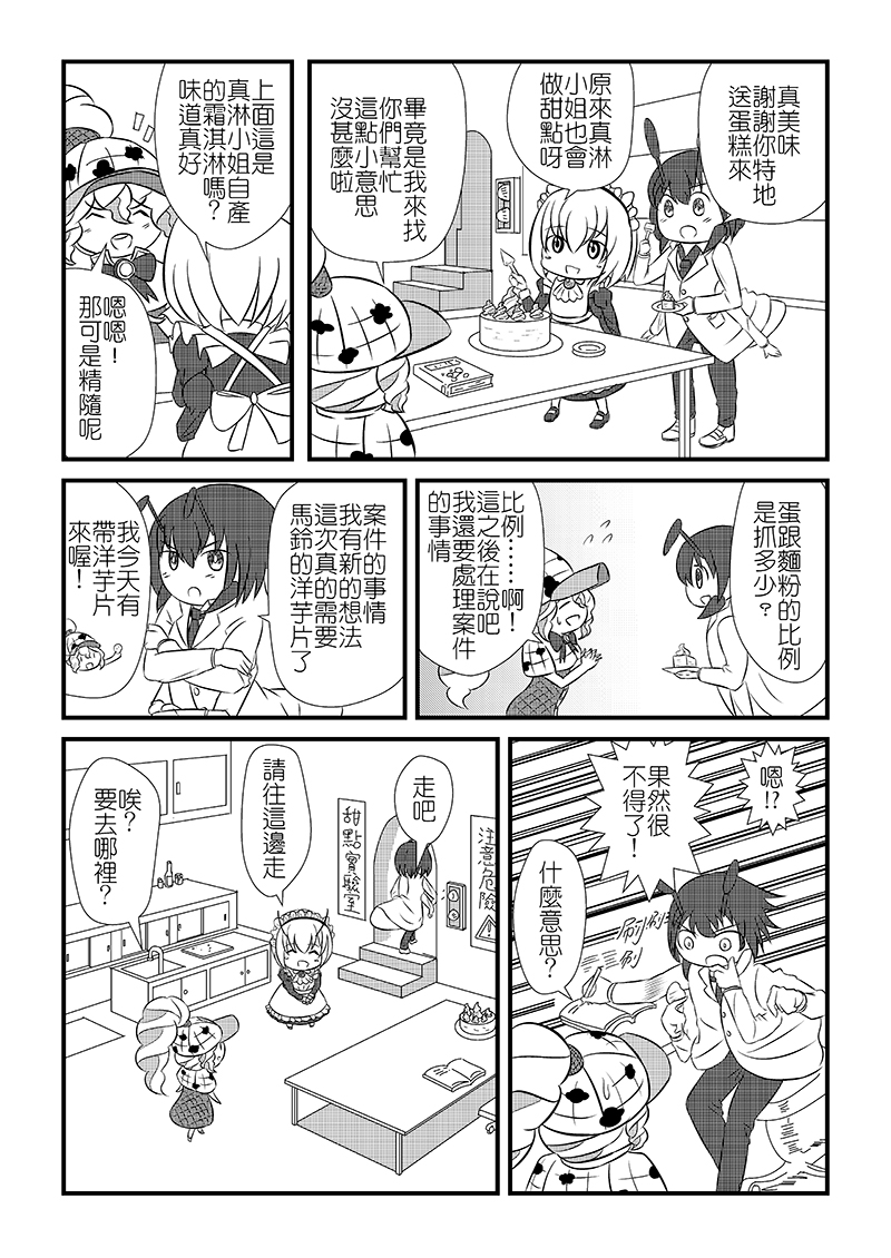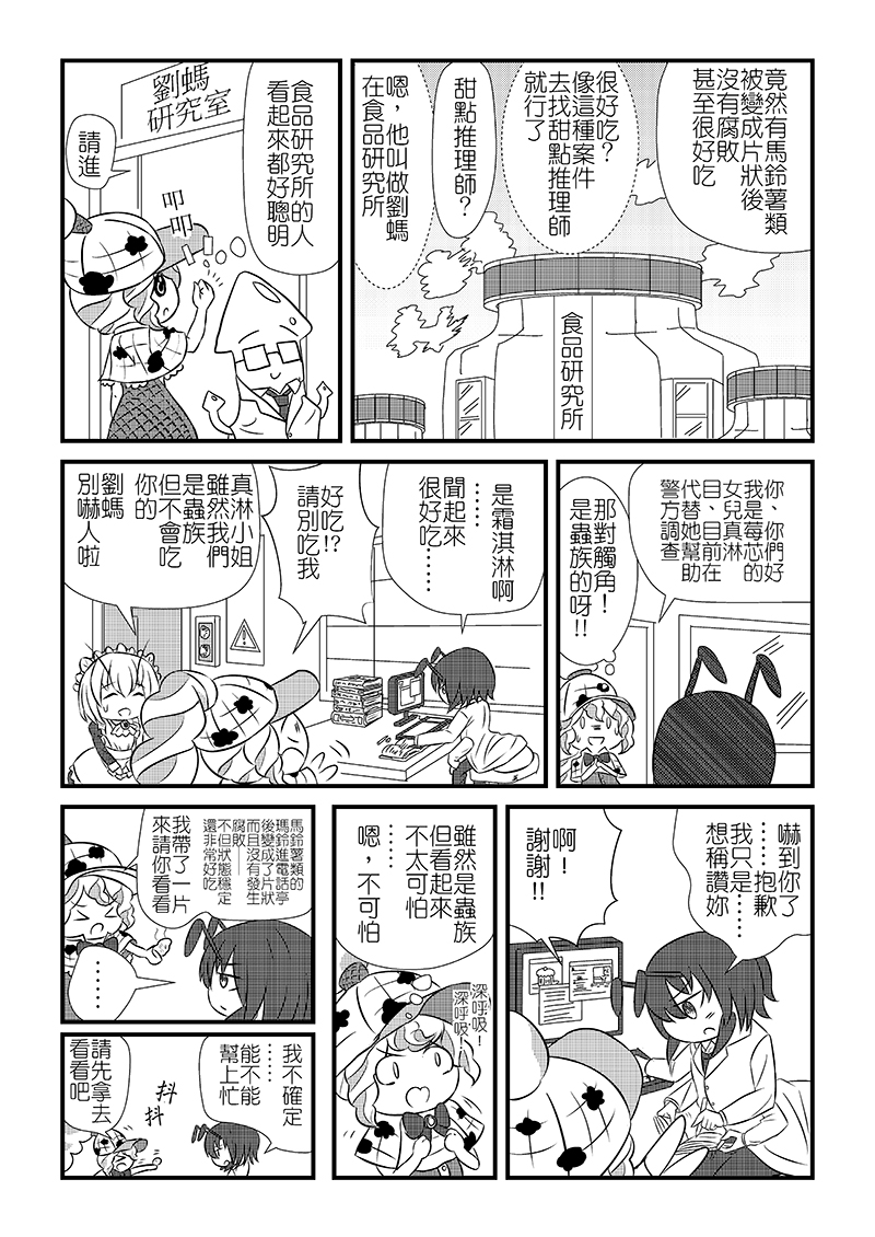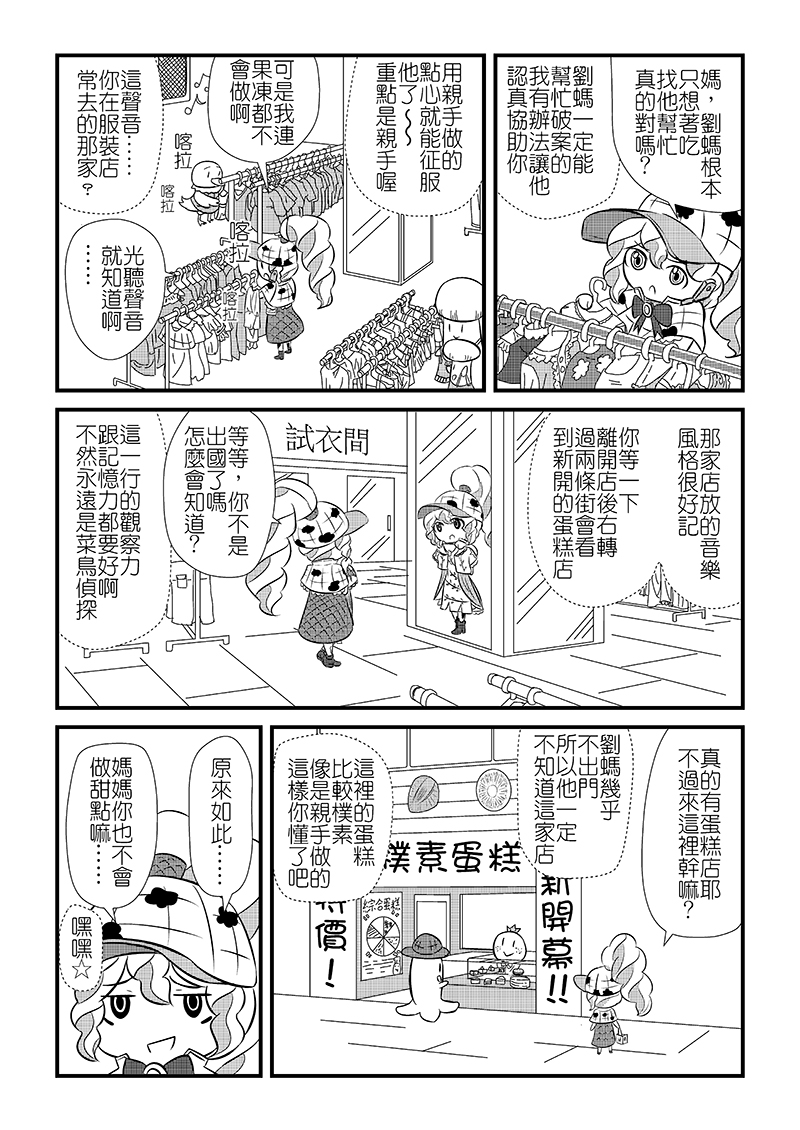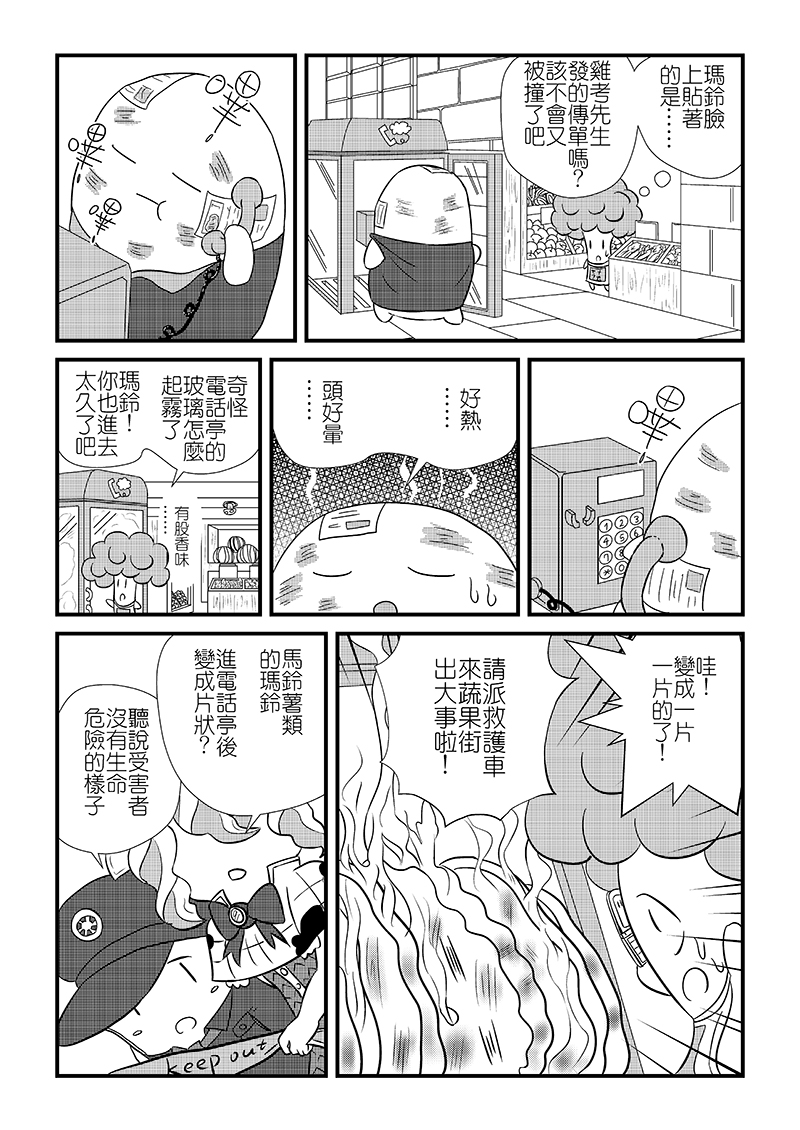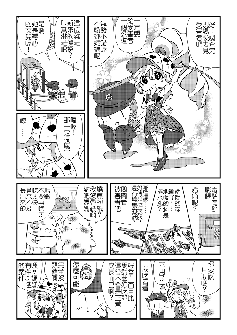 在蔬果街,體型龐大的馬鈴薯「瑪鈴」總是撞到路人而被報復,被切成一片一片的瑪鈴雖然沒有生命危險,卻不知道為何會變成這樣。新人偵探「真淋」也弄不清原因,打電話給同為偵探的母親後得知了「甜點推理師」這號人物……