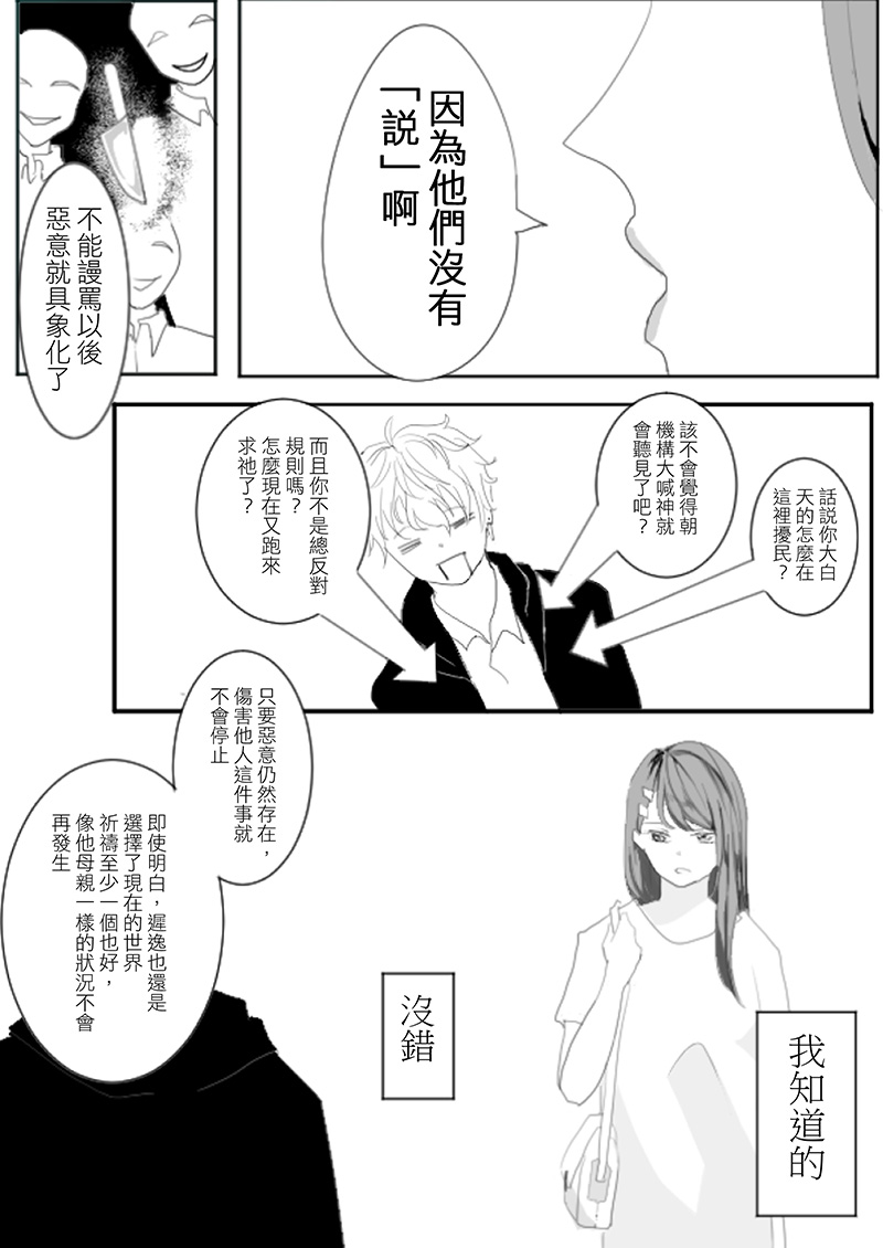 近幾年網路霸凌導致輕生的事件層出不窮。即使控管了言語,也很難保證就不會有人受到任何不講理的攻擊。在這樣的前提下,如果身邊親近的人被傷害了,我們能夠採取怎樣的行動就更關鍵。也希望透過這個故事讓抱持著玩笑心態打趣他人的人能夠更警覺話語的重量。
