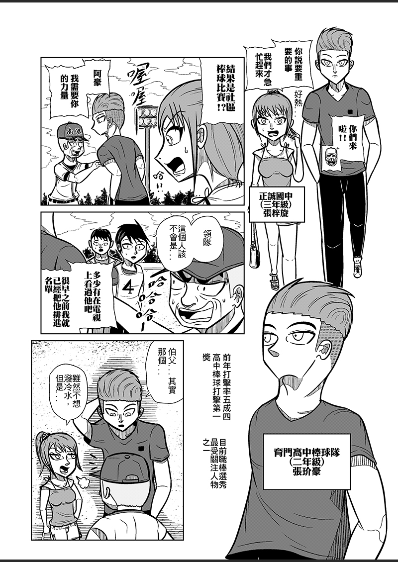張玠豪-育門高中二年級生,育門高中棒球隊主將,全國高中棒球受矚目新秀之一,個性單純認真對棒球不喜歡搞小手段