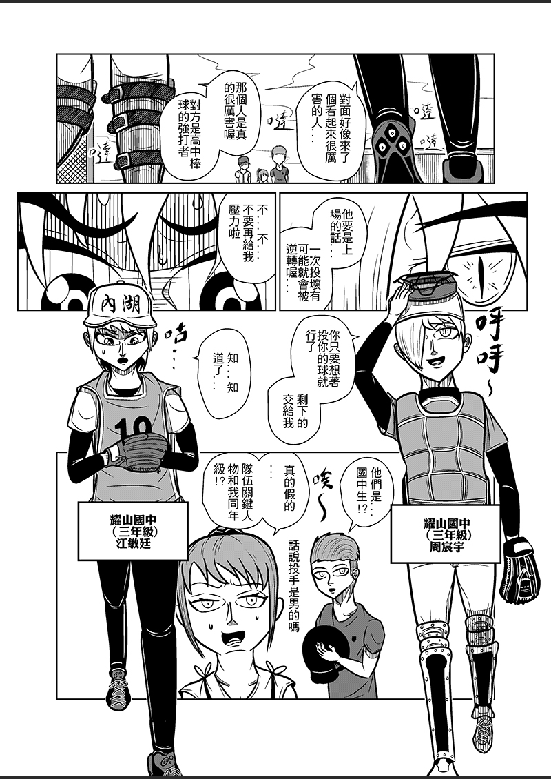 周宸宇-耀山國中三年級生,內湖社區棒球隊捕手兼隊長,囂張愛挑釁,為獲勝就算要毀掉對手也不手軟,擅長心理戰專攻對手弱點,被人稱為『狙擊捕手』