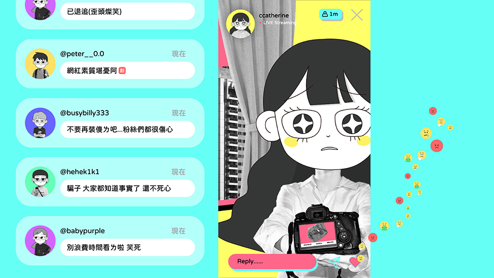 我們想透過這個作品諷刺現代人容易被社群媒體上的資訊蒙蔽被風向操控。結合真實的攝影與電腦繪圖製作而成的MG動畫,透過這樣的媒材想要表達整個劇本亦真亦假的概念,並以停格動畫的手法以及彷彿戴著面具的腳色來表達社群軟體虛偽的感覺。
