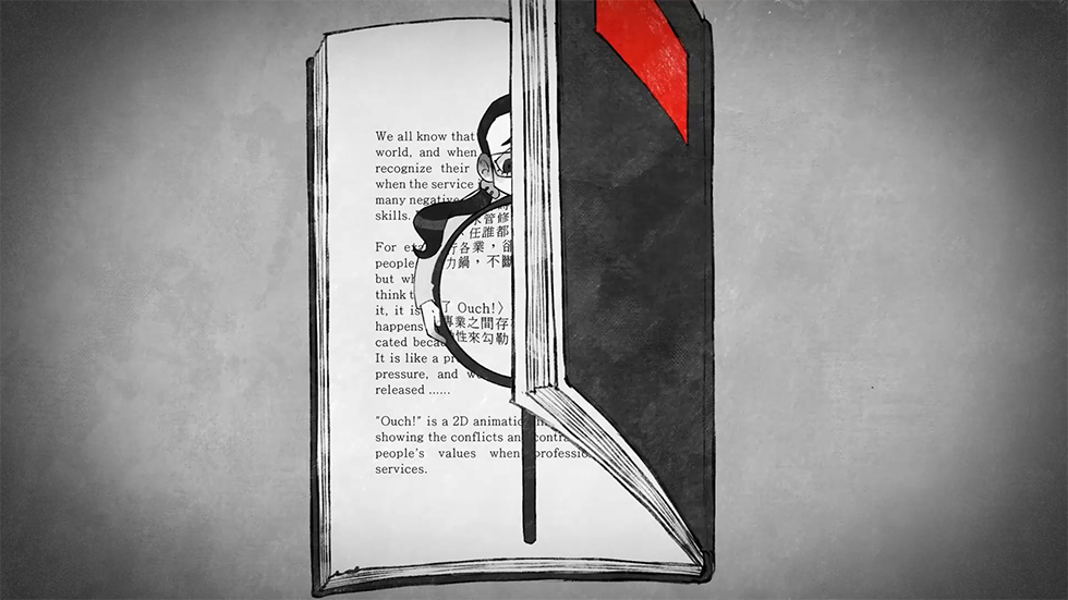 〈別凹了 Ouch!〉將八個職業所遇到的「不尊重專業的情景」,以抽象和暗喻的方式呈現於四分鐘的2D動畫短片之中。表現出每種專業與大眾之間存在的衝突與矛盾,並藉由畫面游移的連動性來勾勒出一種無形結構下人們無法擺脫的法則。