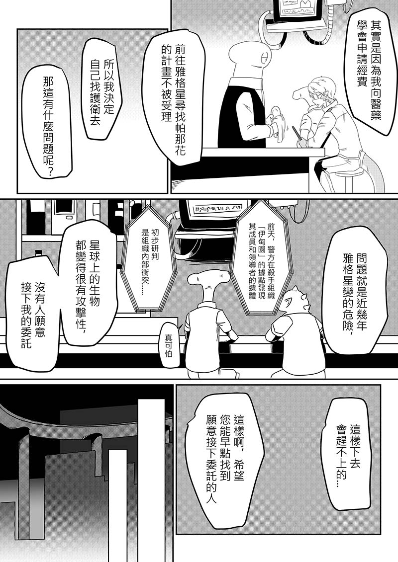 有一位藥草學者計畫雇用一名護衛一起去尋找傳說中的神奇藥草「帕那花」,但一直沒有人願意接受他的委託,正在他為此苦惱的時候,有一個人出現了......