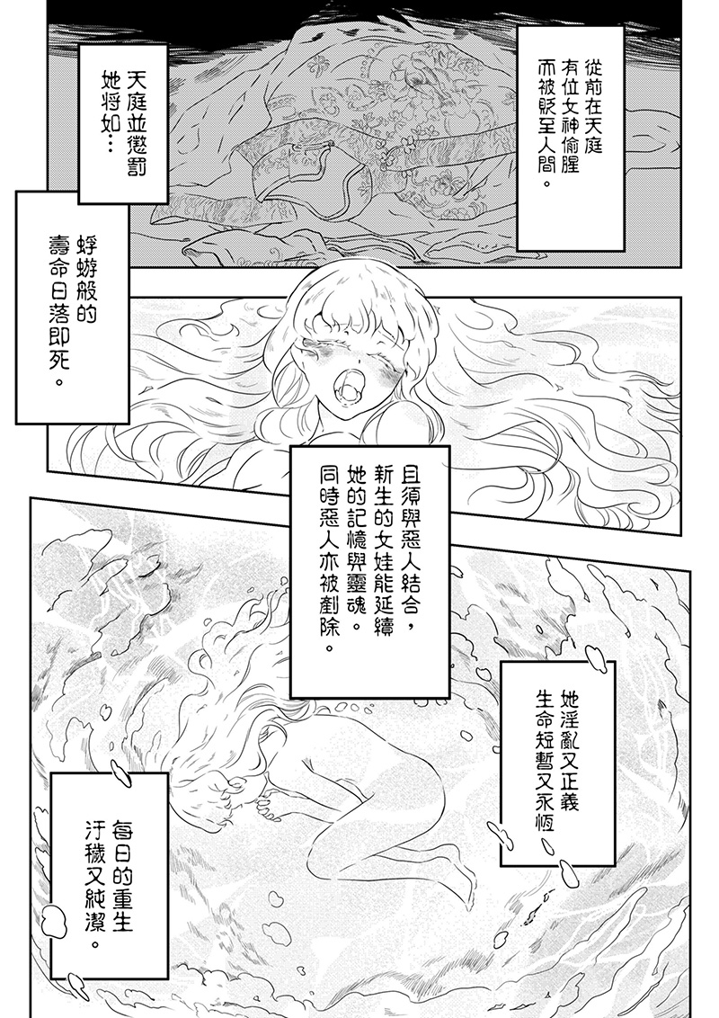 從前在天庭有位女神偷腥而被貶至人間,天庭並懲罰她將如蜉蝣般壽命且須與惡人結合...她淫亂又正義,生命短暫又永恆,她被稱為洗白魔女。