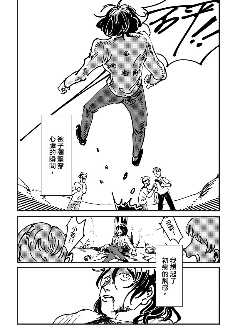 「被子彈擊穿心臟的瞬間,我想起了初戀的觸感。」希望大家把這個故事當成一則用心良苦的笑話來看待。