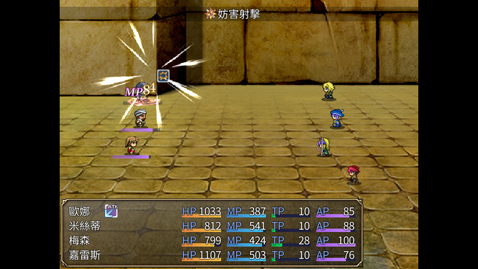本遊戲主打高策略性與高平衡度的ATB戰鬥系統,必須「動一步、看兩步、想三步」制定戰鬥策略。利用「待機」調整AP行動條,觀察對手或配合隊友的行動。若盲目行動,恐被敵人施展「準備中」的強大技能使戰鬥局勢不利!