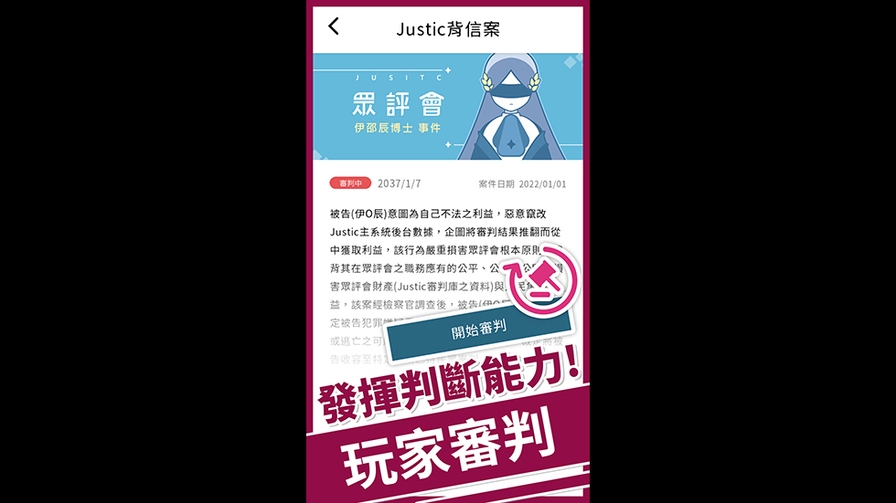 在現代社會,網路文化中的標題黨現象普遍存在,很多人只透過標題就擅自定論,缺乏全面了解的能力。因此,這款遊戲結合了英美法系的「陪審團」中的國民法官制度,提供一個讓每個人都能體驗成為法官的遊戲。